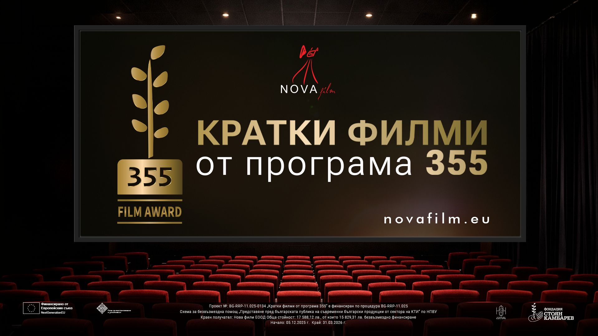 Проект № BG-RRP-11.025-0134 „Кратки филми от програма 355“ е финансиран по процедура BG-RRP-11.025 „Представяне пред българската публика на съвременни български продукции от сектора на КТИ“ по НПВУ.