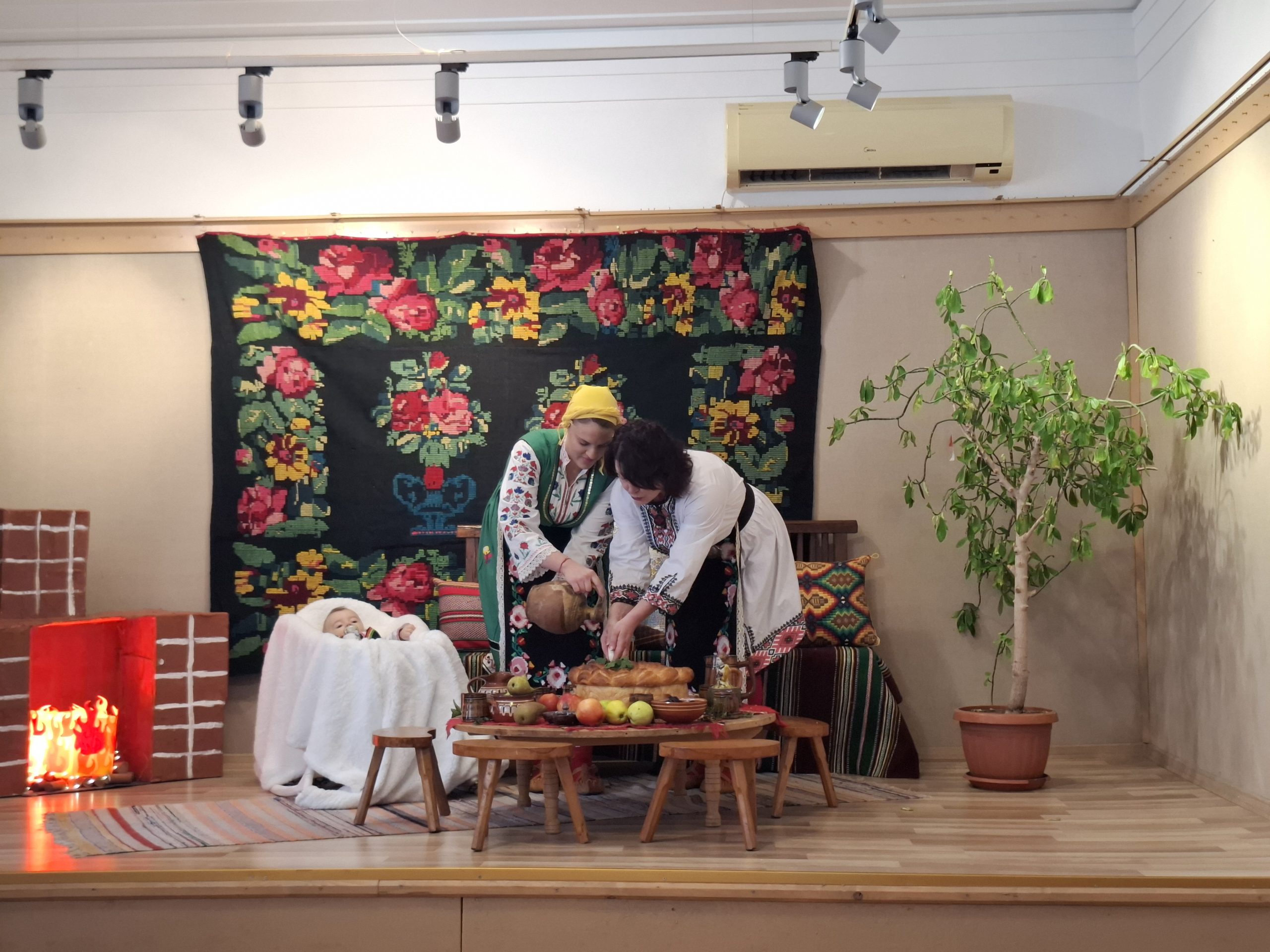 В ролята на бабата-акушерка се превъплъти Веселина Кръстева, а младата майка и нейното бебе бяха представени от Деница Колева и малкия Димитър. С много символика и уважение бе пресъздаден обичаят – младата булка завърза престилка на бабата, поля ѝ вода да си измие ръцете и я дари с кърпа – знак на признателност за грижата и помощта при раждането.